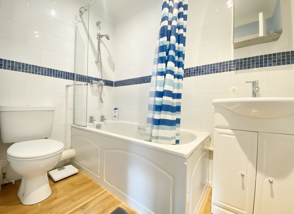 This stylish one-bedroom apartment impresses with its contemporary design and functional layout. The bright and airy open-plan living area is enhanced by large windows, allowing for an abundance of natural light and creating a welcoming atmosphere. Modern wooden flooring flows throughout the space, complemented by built-in storage solutions and a mirrored wardrobe for added practicality. The sleek kitchen features integrated modern appliances, a striking chequerboard backsplash, and convenient under-counter washer, making it ideal for both daily living and entertaining. The cosy bedroom offers a comfortable retreat with warm wood flooring and generous natural light, while the modern bathroom boasts a bath-tub with shower, blue mosaic tile accents, and ample storage.