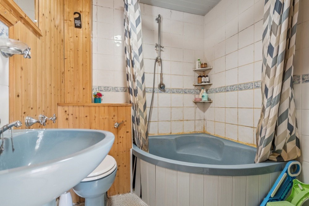 Tiled walls and flooring, w.c, wash hand basin, corner bath with shower attachment.