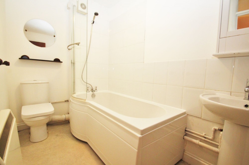 Panel enclosed bath with mixer tap and shower attachment, pedestal wash hand basin, low level WC, wall mounted heater, part tiled walls, fitted carpet.
