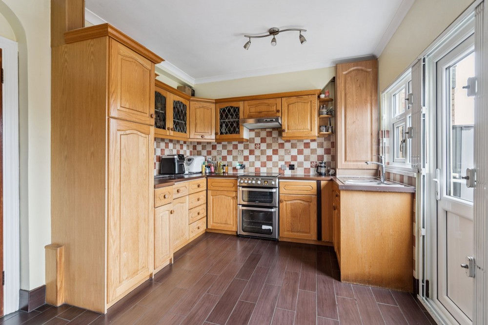 Rear aspect double glazed window, French doors leading to garden, radiator, space for cooker, plumbing for washing machine, sink with drainer, range of base level and wall mounted units.