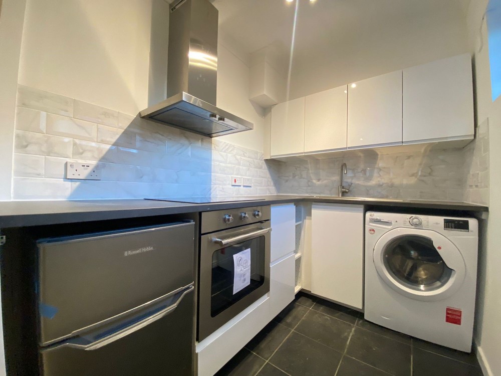 The flat features a well-appointed bedroom/reception room that serves as a versatile area for relaxation and entertainment. The bathroom is modern and functional, catering to all your daily needs.