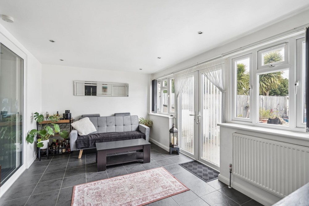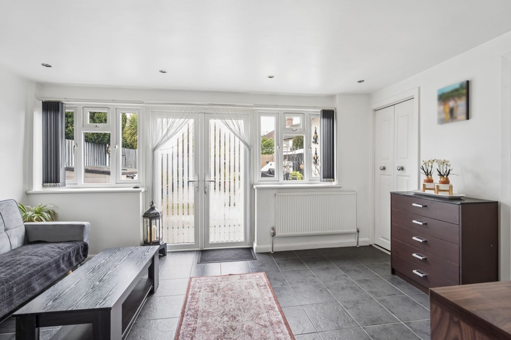 Rear aspect double glazed windows and French doors leading to garden, tiled flooring and radiator.