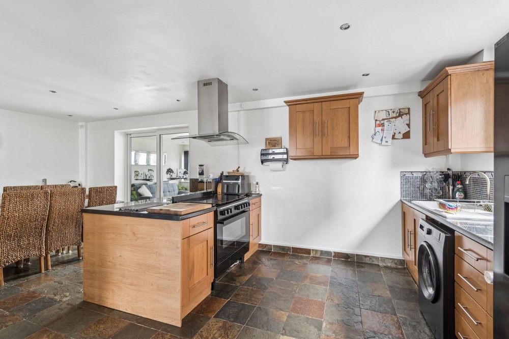 Side aspect double glazed window, radiator, tiled flooring. Kitchen area with plumbing for washing machine, space for range cooker, sink with drainer, range of base level and wall mounted units. patio doors leading to;