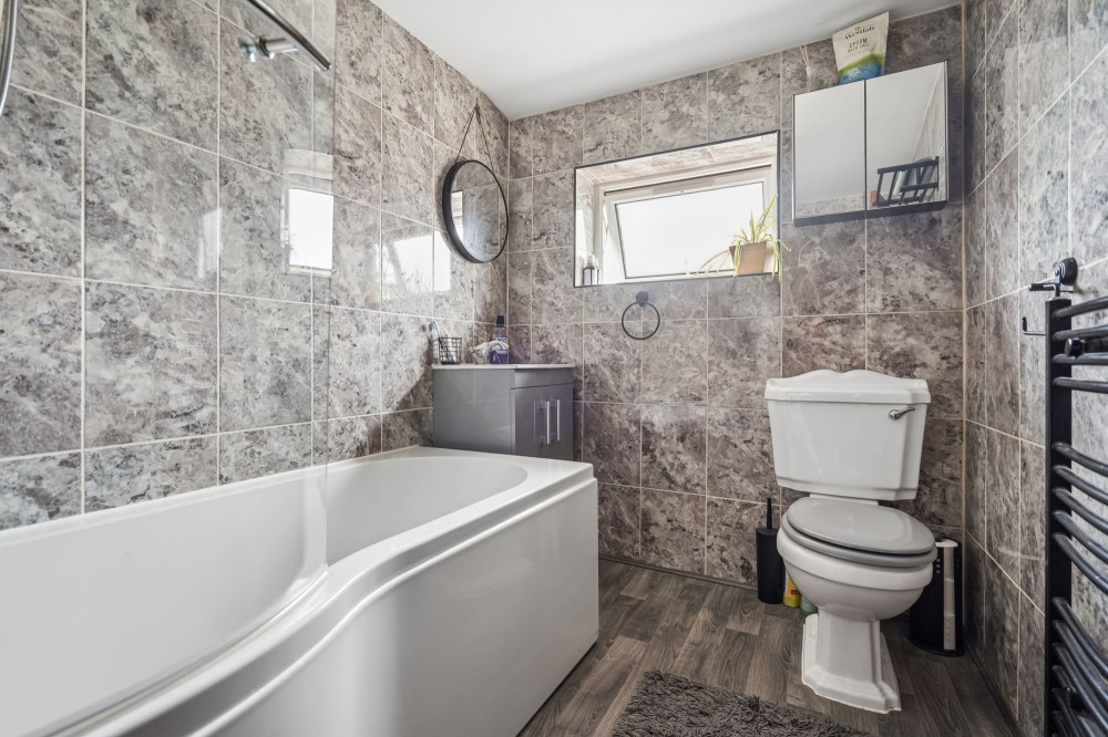 Tiled walls and flooring, bath with shower attachment, w.c, wash hand basin with cupboard under.