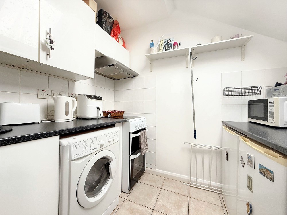 Tiled floor, plumbing for washing machine, space for cooker, space for fridge/freezer. All white goods included, washer/dryer machine , ceramic hob cooker, with extractor, fridge and freezer