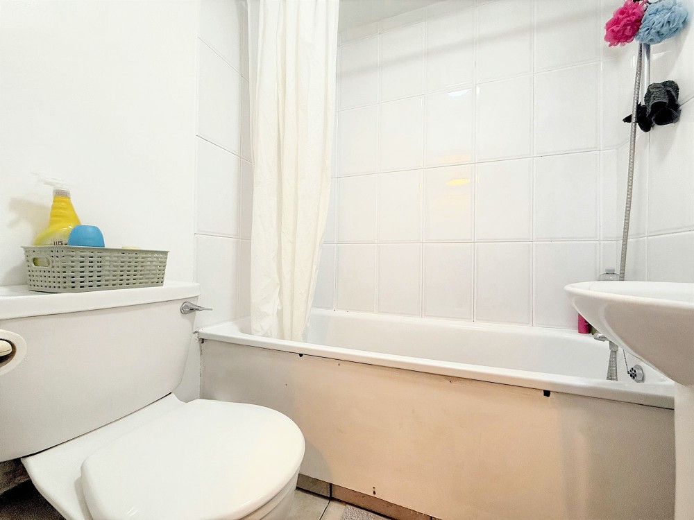 Tiled walls, bath with shower attachment, w.c, sink with drainer.