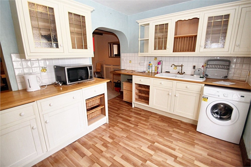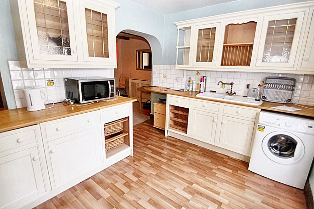 This impressive four-bedroom, one-bathroom semi-detached house offers a perfect blend of classic style and modern functionality. The heart of the home is the spacious kitchen, featuring wooden countertops, traditional cabinetry, and an integrated wine rack, providing both warmth and practicality. The inviting reception room is ideal for relaxing or entertaining, while French doors open directly onto a generous patio and lawn, seamlessly connecting indoor and outdoor living spaces.