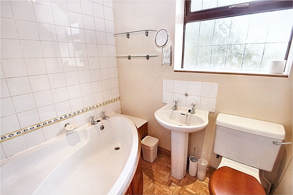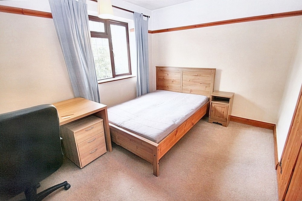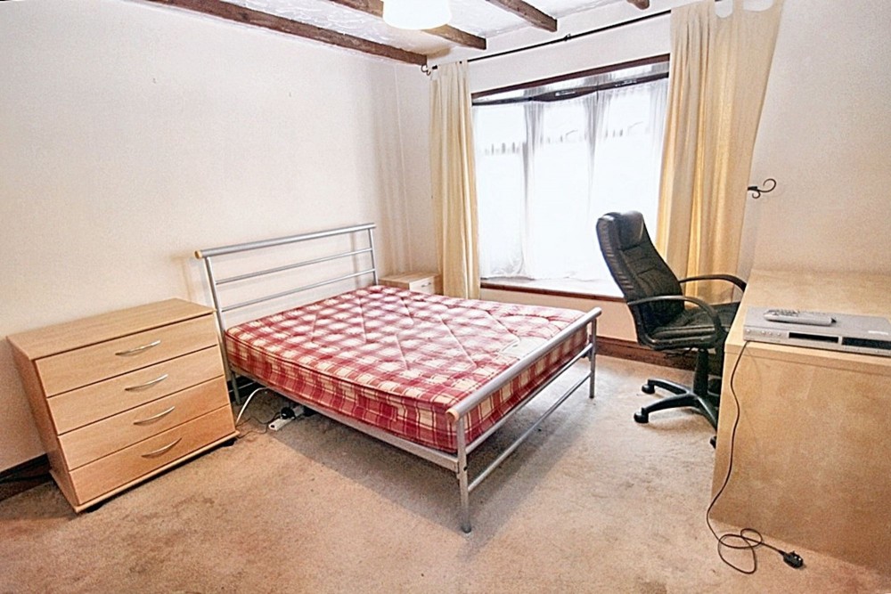 Each bedroom is bright and airy, with large windows flooding the rooms with natural light. Highlights include exposed wooden beams and built-in desks, making these spaces flexible for home working or study. The bathroom is finished with modern touches, including a stylish bath-tub, pedestal sink, decorative tile border, and classic wooden flooring for added comfort. Outside, the property boasts a well-maintained front garden and convenient off-road parking on a paved driveway. This delightful family home combines timeless character with thoughtful features to create a welcoming and functional living environment.