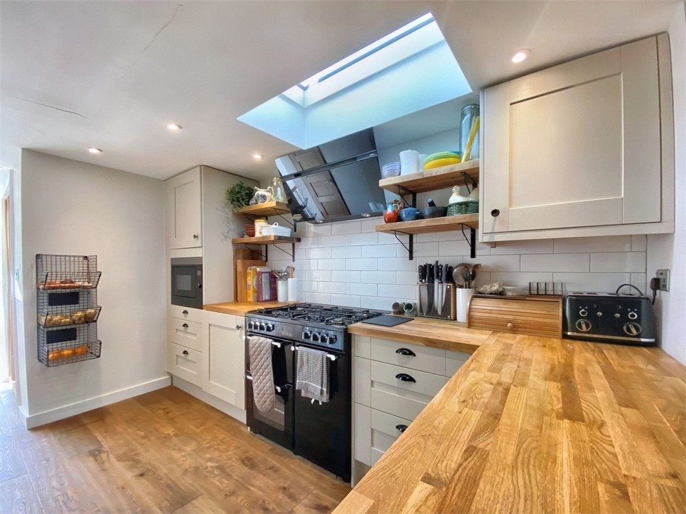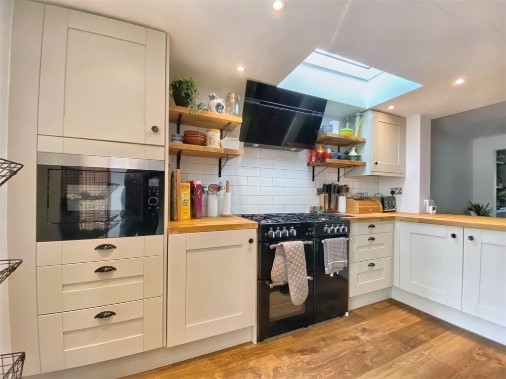 Superbly planned this room offers an excellent range of finished wall and base level units, with feature gas range & filter hood, tiled flooring, sink with drainer, double glazed skylight and rear aspect double glazed window.