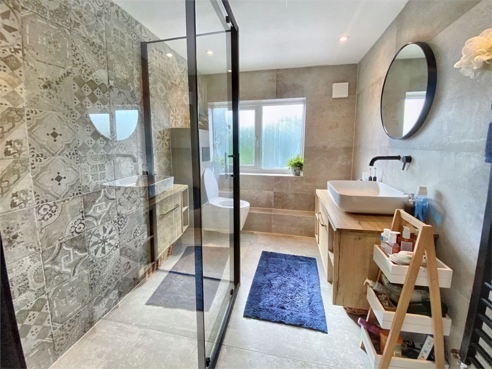 Rear aspect double glazed window, tiled walls and flooring, walk in shower, w.c, wash hand basin with cupboard under.