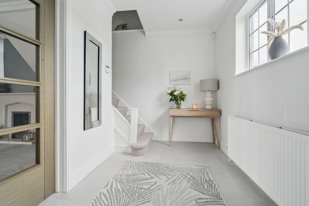 Front aspect double glazed window, tiled flooring, radiator, stairs to;