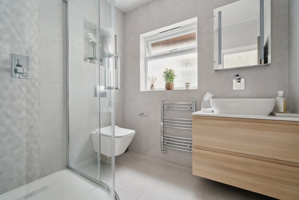 Side aspect double glazed window, tiled walls and flooring, walk in shower, w.c, wash hand basin with cupboards under.