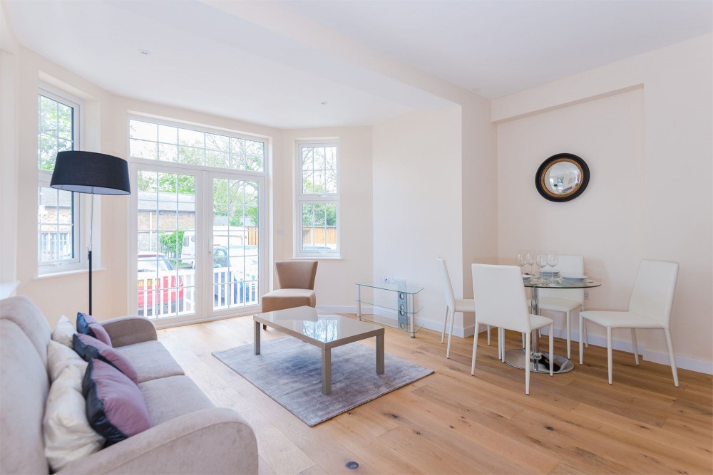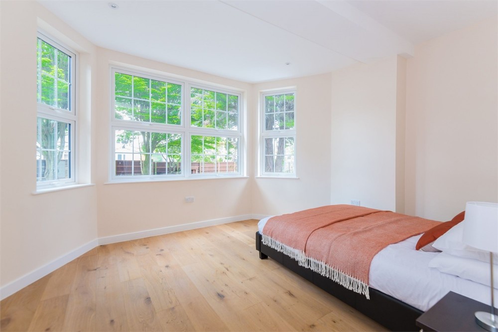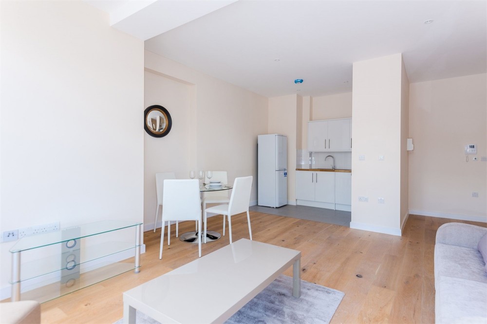 This impressive one-bedroom apartment combines classic period charm with sleek modern finishes, offering a thoughtfully designed layout ideal for contemporary living. The heart of the home is a spacious, open plan living area featuring beautiful wooden flooring and large windows that flood the space with natural light. The seamless connection between the living and dining zones creates an inviting environment for both relaxation and entertaining. The modern kitchen is equipped with glossy cabinetry, ample storage, an integrated oven, and a stainless steel extractor hood, all complemented by a stylish wooden countertop and tiled backsplash. The bedroom is equally bright and airy, benefitting from expansive windows and elegant wooden flooring, providing a tranquil retreat with plenty of space for rest and relaxation. The well-appointed bathroom continues the modern aesthetic, ensuring comfort and convenience.