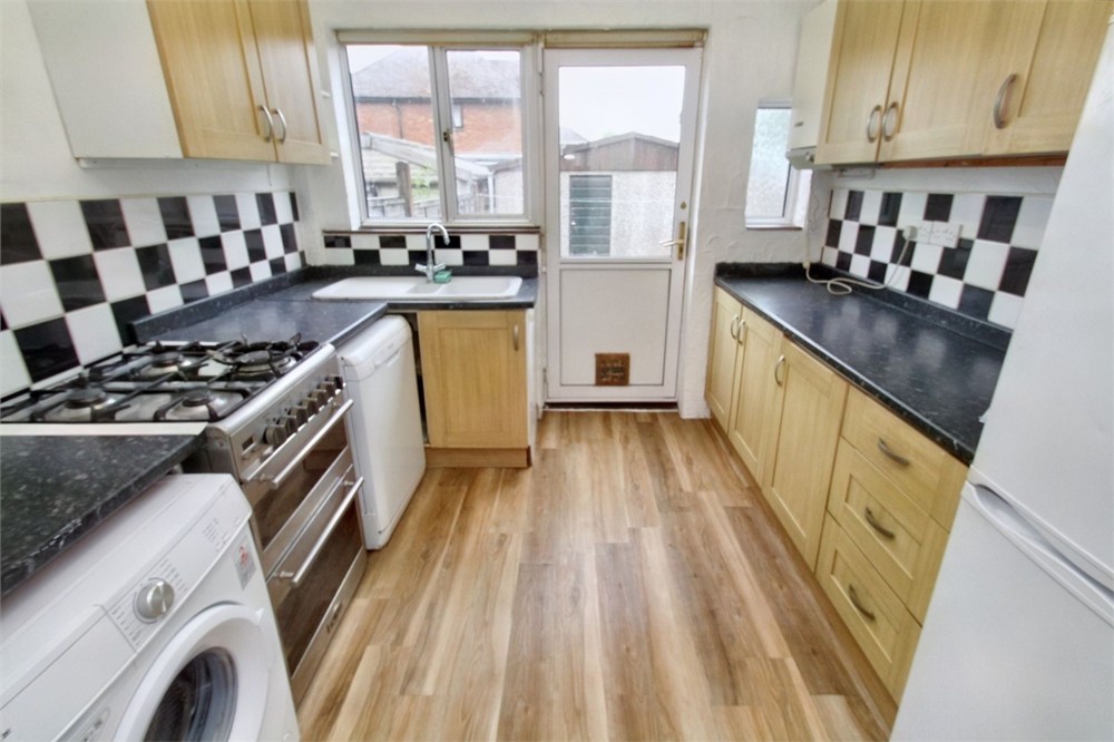 This beautifully presented three-bedroom, one-bathroom terraced house offers a harmonious blend of classic charm and modern convenience. The property features a welcoming reception room with sleek laminate flooring and a characterful fireplace, perfect for cosy evenings in. Sliding doors open directly onto the garden, filling the space with natural light and offering effortless indoor-outdoor living. The kitchen is thoughtfully designed with contemporary wooden cabinetry, modern appliances, and durable laminate flooring, while a practical back door provides easy access to the outdoor areas. Upstairs, the bedrooms are bright and inviting, each benefiting from large windows that allow natural light to flood the rooms. The principal bedroom includes a spacious built-in wardrobe with sleek handles, ensuring ample storage. A striking decorative feature wall in one of the bedrooms adds an elegant and unique touch, while the neutral décor throughout offers a flexible backdrop for personal style.