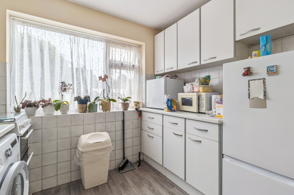 Rear aspect double glazed window, partially tiled walls, plumbing for washing machine, space for fridge/freezer, sink with drainer, range of base level and wall mounted units.