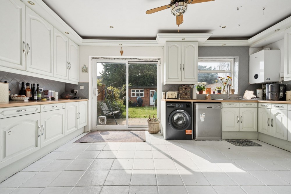 Rear aspect double glazed window with patio doors leading to the rear garden, tiled flooring, plumbing for washing machine and dishwasher, space for range style cooker, sink with drainer, range of base level and wall mounted units.