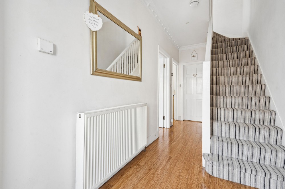 Wooden flooring, radiator, stairs to first floor, doors to;