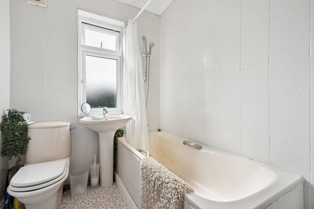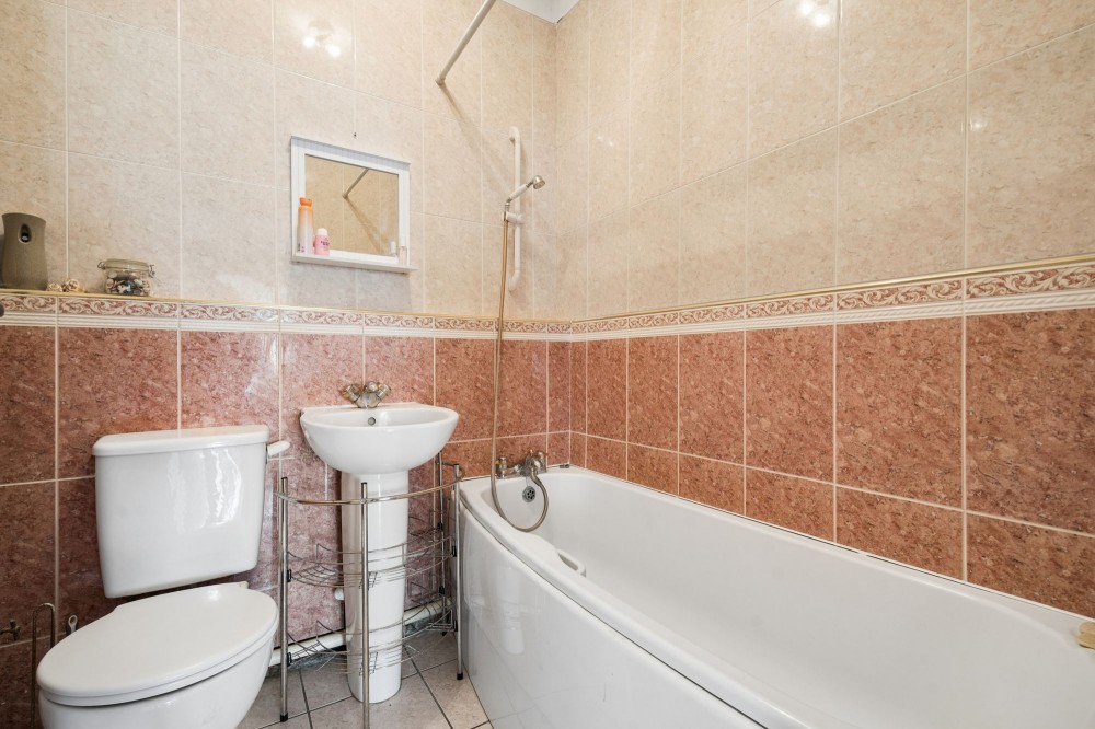 Tiled walls, w.c, wash hand basin, bath with shower attachment.