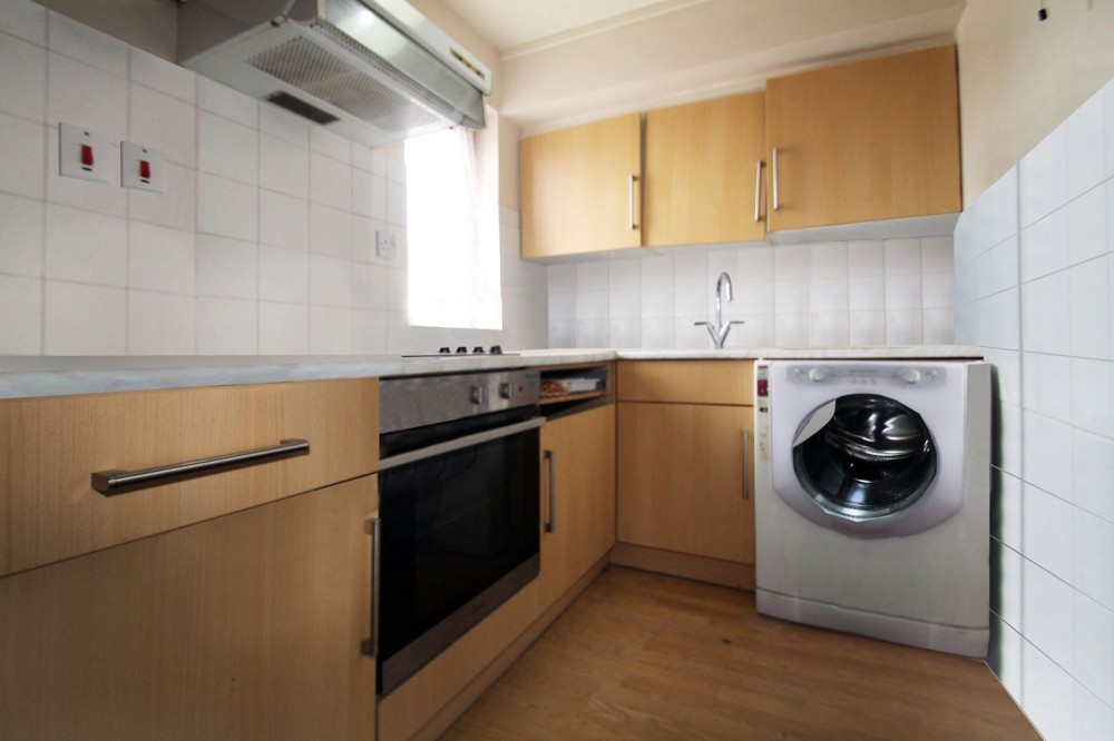 Side aspect double glazed window, plumbing for washing machine, sink with drainer, integrated electric hob and cooker, range of base level and wall mounted units.