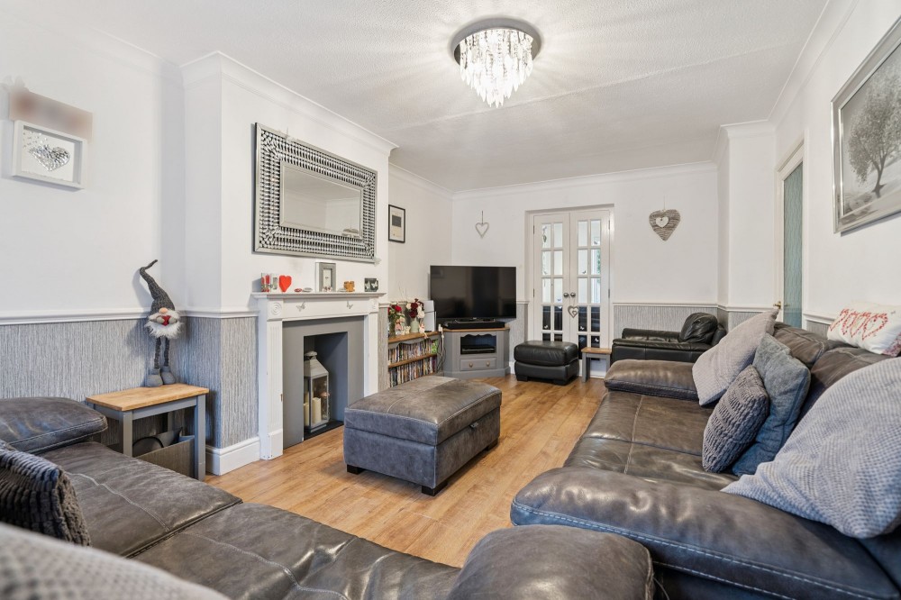 Front aspect double glazed window, wooden flooring, radiator, t.v point, French doors leading to kitchen/dining room.