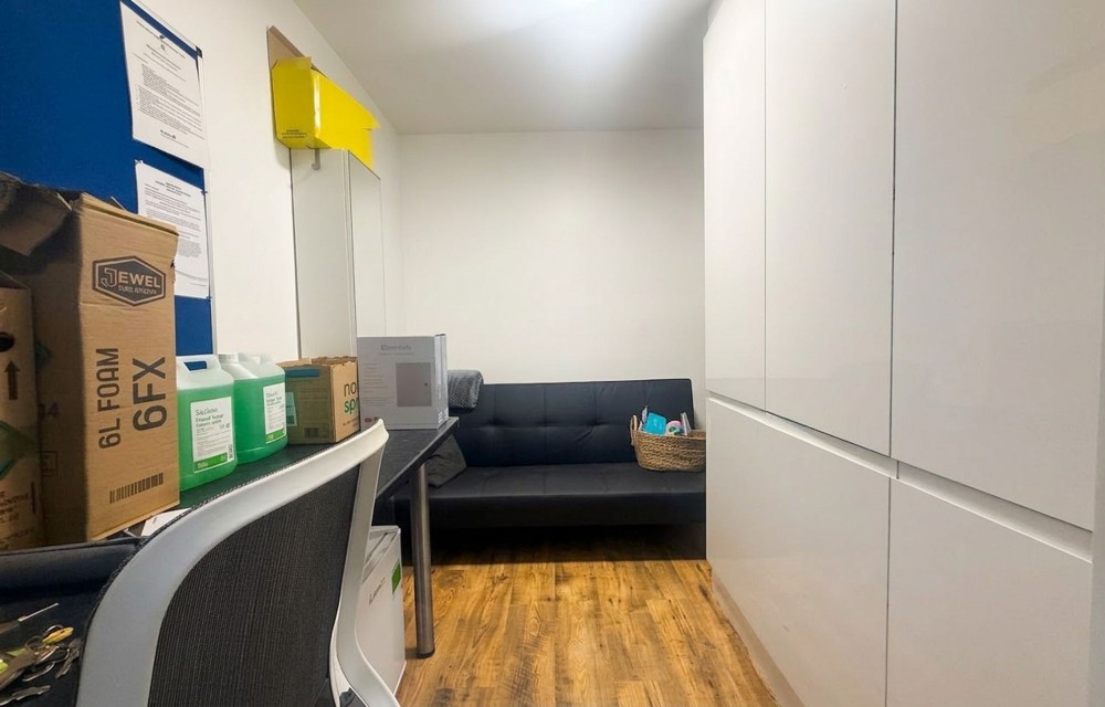 Wooden Flooring, radiator, integrated storage cupboard.