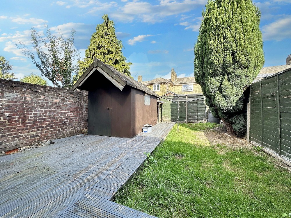 Upstairs, two well-proportioned bedrooms provide ample space and comfort, each enhanced by large windows or skylights, wardrobes, and elegant wooden flooring. The modern bathroom features a bath with overhead shower, a vanity unit with built-in storage, and tiled finishes for easy maintenance. Additional highlights include a practical decked area in the rear garden, a storage shed, and a bright attic room that could serve as a guest room or home office. With high-quality fixtures throughout and abundant natural light in every room, this home is ready for you to move in and enjoy.