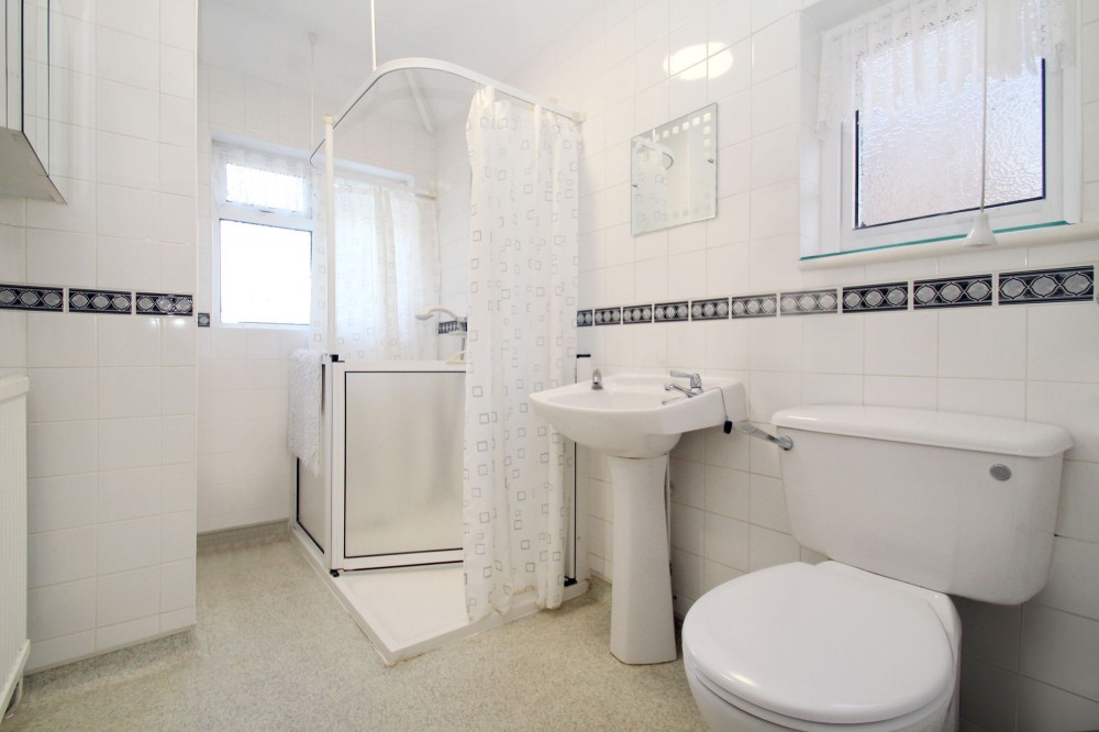 Rear aspect double glazed window, tiled walls and flooring, w.c, pedestal wash hand basin, walk in shower.