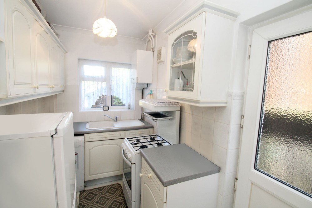 Rear aspect double glazed window, sink with drainer, space for cooker, plumbing for washing machine, range of base level and wall mounted units.