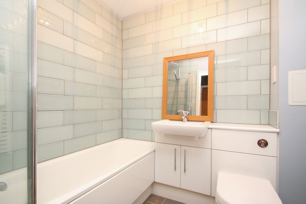 Tiled walls and flooring, w.c, wash hand basin with cupboard under, bath with shower attachment.