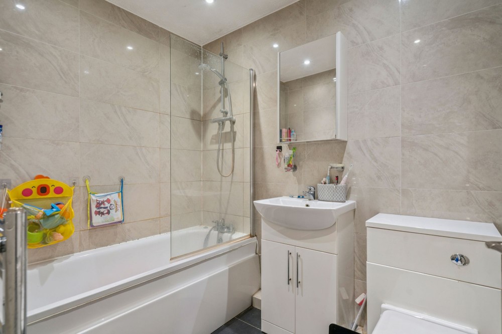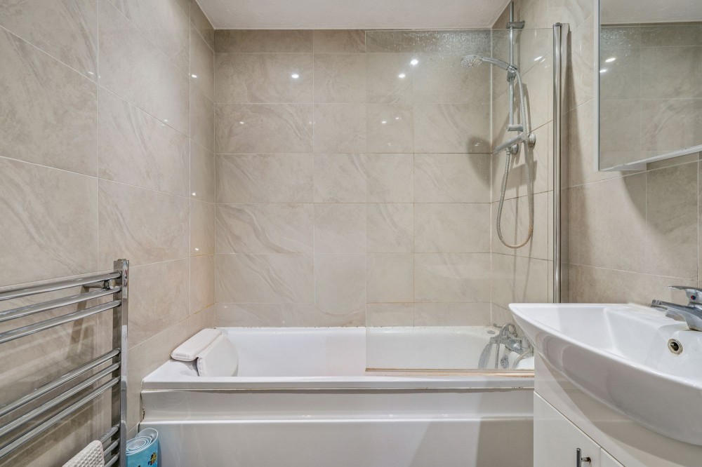 Tiled walls, wash hand basin with vanity unit, w.c, bath with shower attachment.