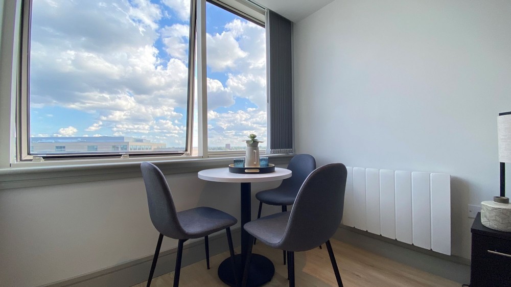 This beautifully presented one-bedroom flat offers a bright and contemporary living experience, thoughtfully designed for comfort and style. The open-plan layout seamlessly integrates a modern kitchen with sleek cabinetry, integrated Siemens appliances, and stylish countertops, flowing into a cosy living area with wood flooring, ample natural light, and built-in storage. The spacious bedroom features large windows, plush furnishings, and elegant wooden flooring, creating a warm and inviting retreat. A compact dining space by the window provides the perfect spot for relaxed meals with a view.