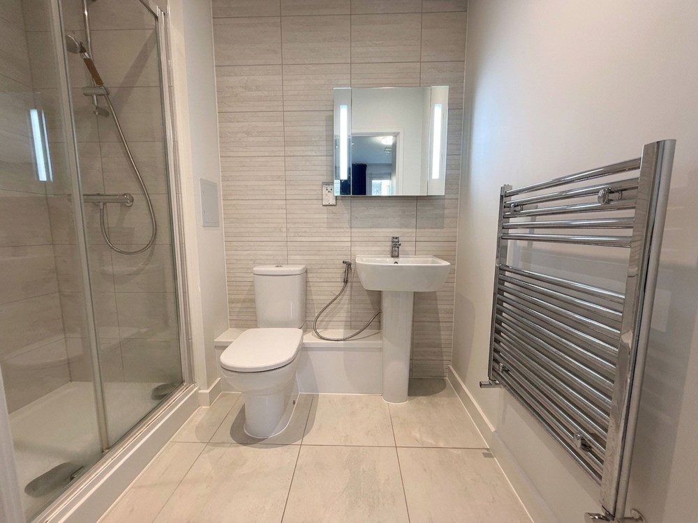 Tiled flooring and walls, walk in shower, w.c, wash hand basin, air purifying system.