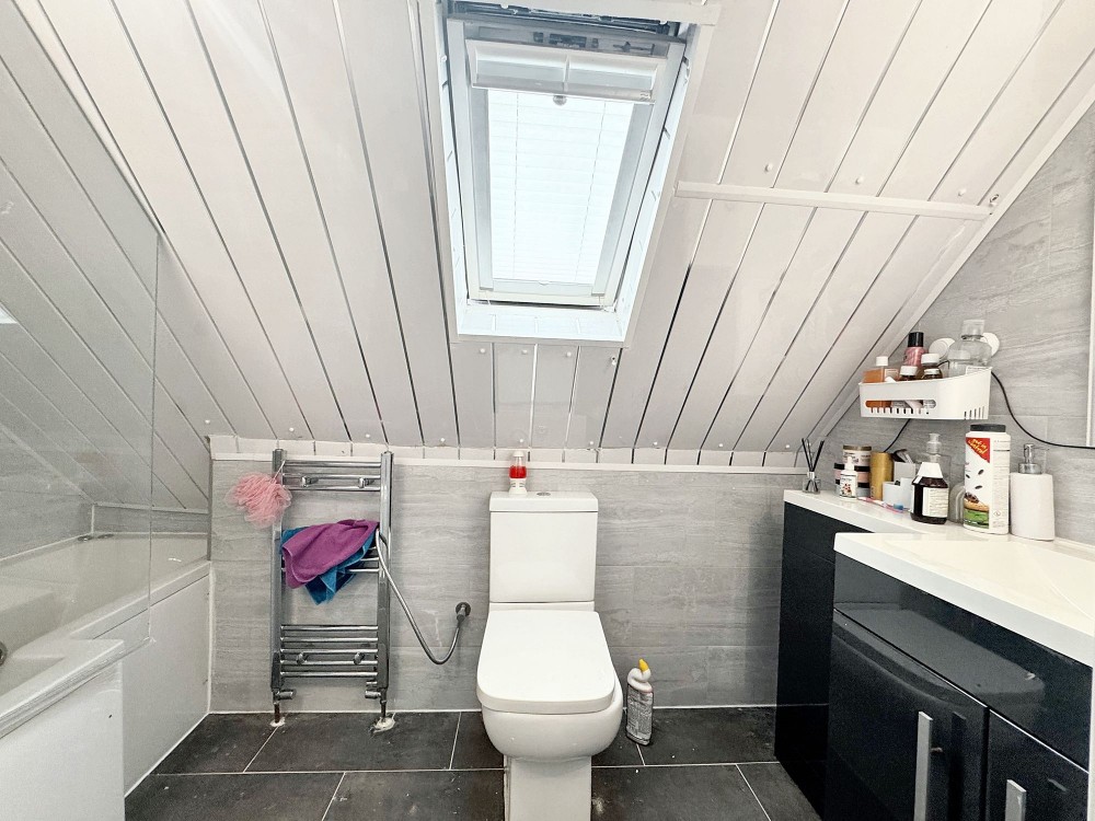 Tiled walls and flooring, side aspect double glazed window, bath with shower attachment,w.c, wash hand basin.