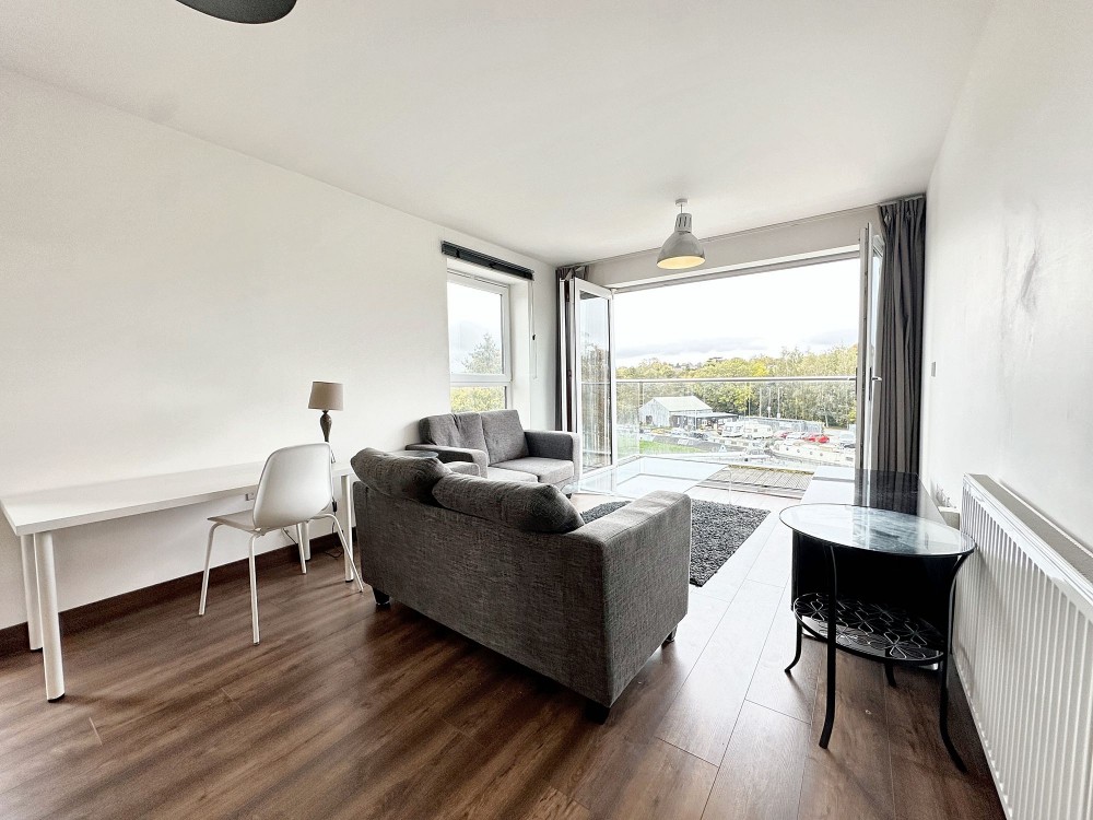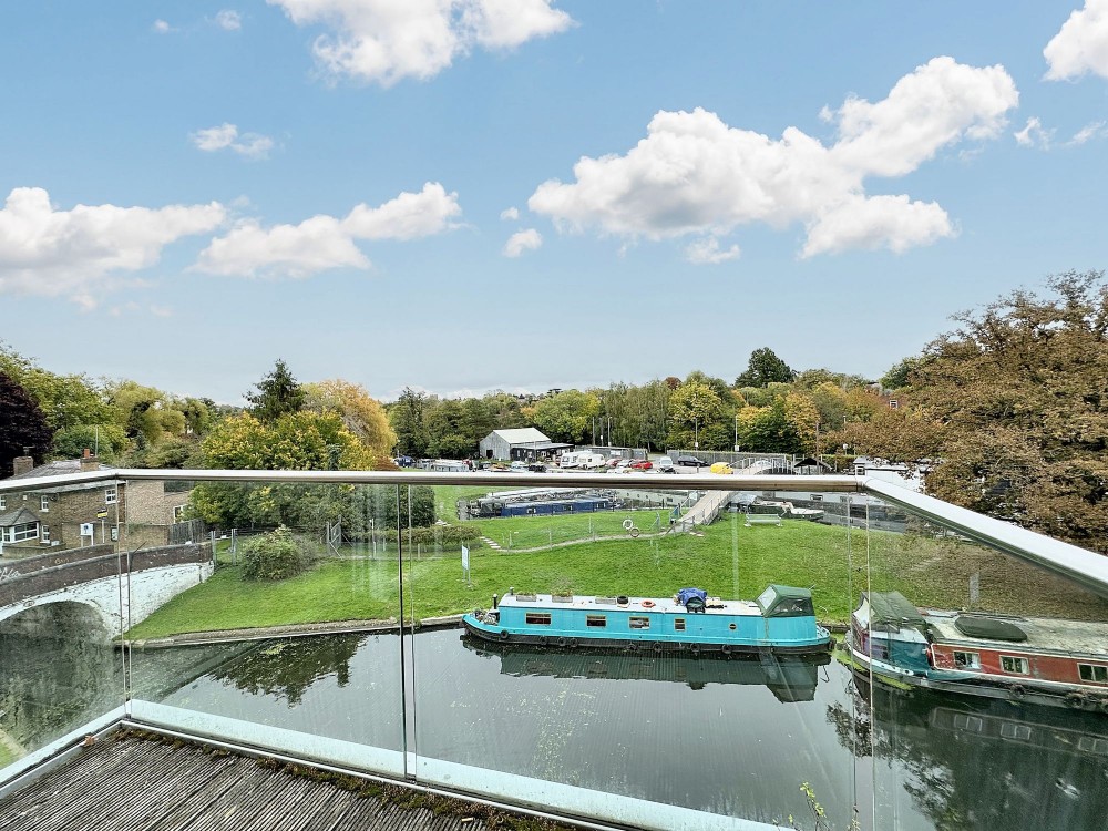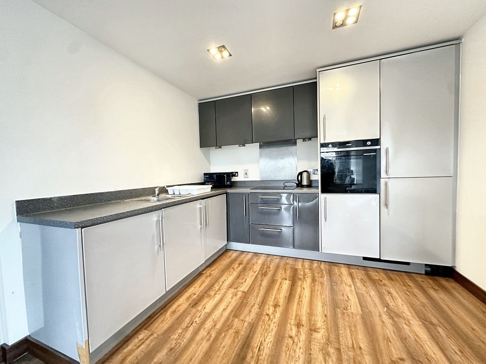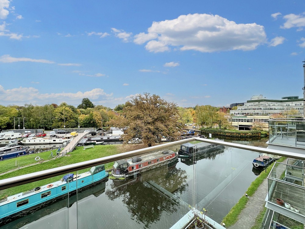 This outstanding two-bedroom, two-bathroom apartment offers a rare combination of contemporary style and serene riverside living. The spacious open-plan reception benefits from sleek modern flooring and is flooded with natural light, thanks to large bi-fold doors that lead directly onto a private balcony with contemporary glass railing. Here, you can enjoy sweeping riverside views, mature trees, and tranquil water features - creating the perfect setting for both relaxation and entertaining. The apartment's modern kitchen is equipped with glossy units, an integrated oven, ample countertop space, and stylish wooden flooring, making it ideal for home cooks and those who love to entertain.