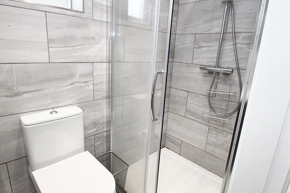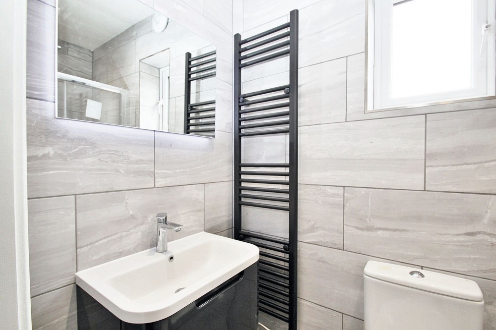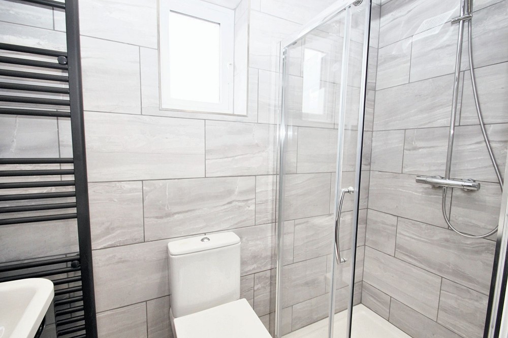 The bathroom features a luxurious walk-in shower with a glass enclosure, complemented by contemporary grey tiling and a heated towel rail for comfort and style. Modern fixtures, stylish lighting, and a large illuminated mirror enhance the sense of sophistication and practicality. Every aspect of this apartment highlights thoughtful design and high-quality finishes, making it an ideal choice for those seeking a modern and comfortable home environment.